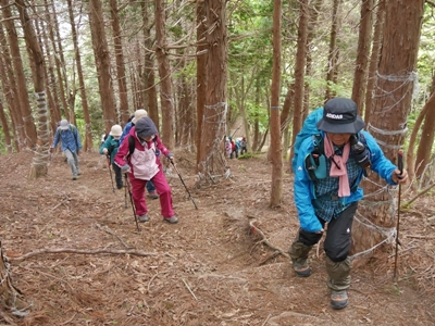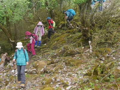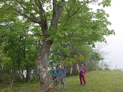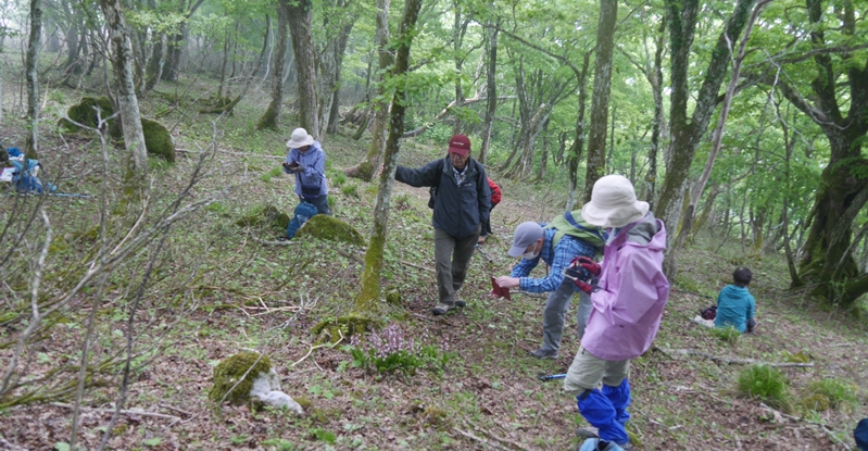| この尾根で鹿に影響されないためか、花が咲いているのは少なかったですが、たくさんの種類の樹木が見られ、帰り道は樹木の観察をたのしみました。オオイタヤメイゲツ(ハウチワカエデ)、シロモジ、マルバアオダモ、サワフタギ、マユミ、ナナカマド、道に花穂を落としたアズキナシ、道に実を落としたオニグルミ、珍しいヒトツバカエデやミツバウツギ等々。行きで急登だったところは帰りは激下りとなり、みんな慎重に一歩ずつ下りました。全員無事峠まで下りてきました。最後に記念写真を撮って観察会を終了しました。 |