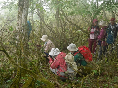 | 5月の伊吹山自然観察会は初めて本山を離れて北尾根を探索する企画をたてました。お天気が少し怪しく当日キャンセルもあり、参加者はやや少なく13名となりました。カッパを着るシーンもありましたが、風はなく涼しい環境で観察会ができました。 |