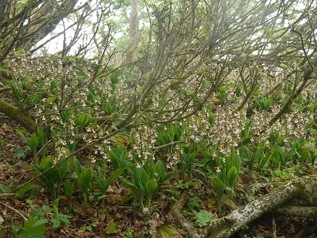 | 尾根に取りつくと道は平坦になりメインのエビネ群生地までは楽に行けました。尾根の周辺もかつては緑が生い茂る道でしたが、鹿の食害か遠くまで見渡せるほど緑が少なくなっていました。ただエビネは不思議と鹿が食べないのか見事な形で群生が残っていました。たっぷり時間をかけて観察を楽しみ、昼食タイムの後、来た道を戻りました。 |