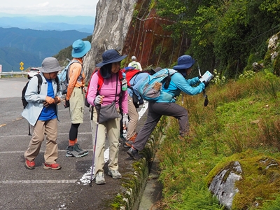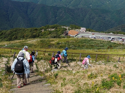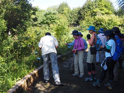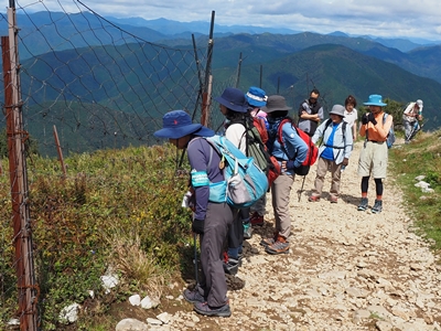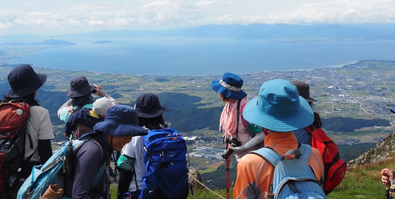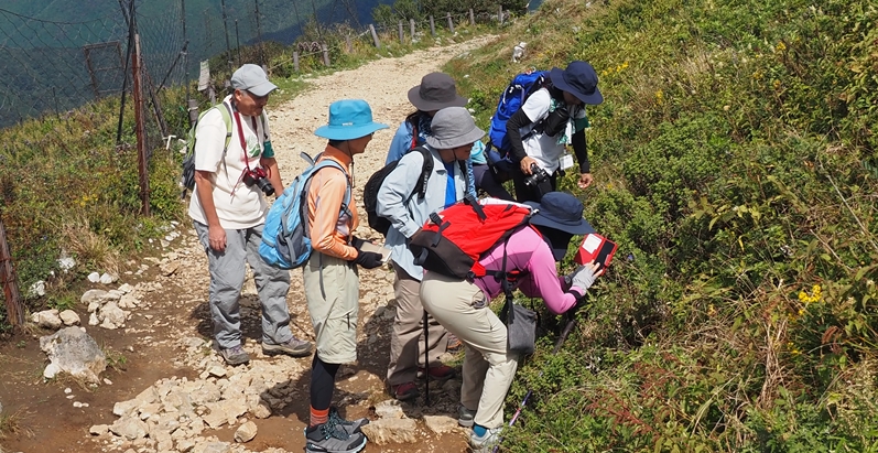 | 今年最後4回目の自然観察会は、10名の参加者でジョイ伊吹薬草園を少し散策した後、ドライブウェイを上がり、山頂下駐車場を基点に午前中は西登山道→琵琶湖展望台→山頂広場(昼食)。午後は、山頂→中央登山道→山頂下駐車場側壁と周回して登山道脇に咲く秋の花観察と琵琶湖の眺望を楽しみました。イブキトリカブト、リンドウ、シオガマギク、ナギナタコウジュなど9月の花々がたくさん咲いていました。外周獣害柵の完成と近年の鹿対策が秋の花の復活にも良い影響となっているようです。ただ今年も夏の酷暑のためかサラシナショウマは酷い状況で終わっていました。今日は天気が良く、琵琶湖展望台からの眺めは最高でした。 |